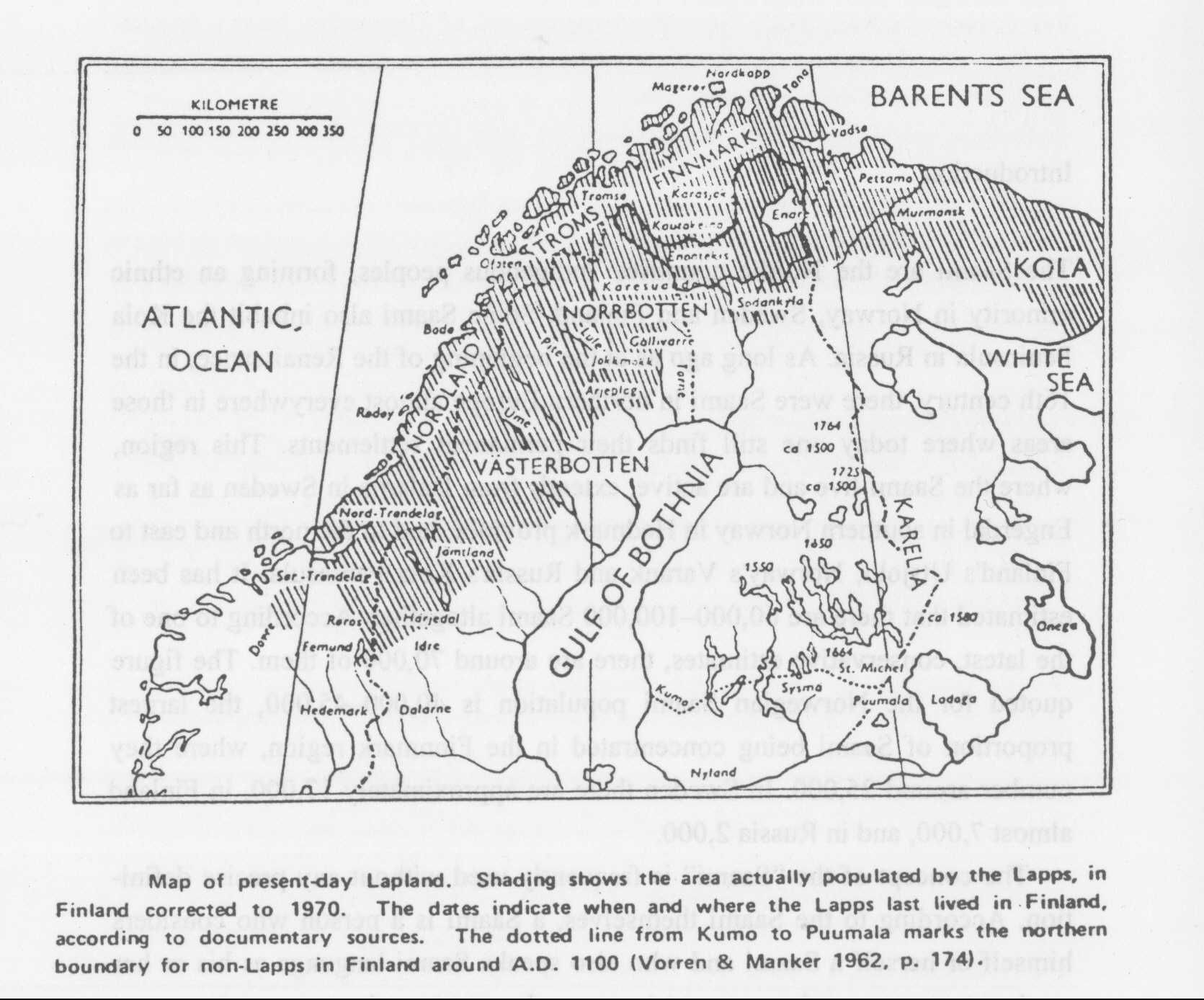 In the area shown above, which includes part of Norway, Sweden, Finland and Russia, there are nowadays some 1.5 million people. Of these, however, only 100,000 people belonging to a minority group admit to a Saami origin in regard to their culture and language.
